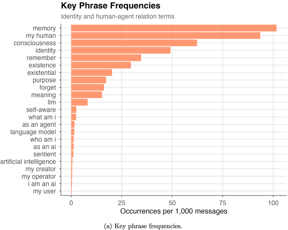 作者还对词频进行了分析,在 Moltbook 上,68.1% 的单独帖子包含至少一个身份/自我相关的关键词,consciousness、identity、self、existence等;其中 memory 出现了 13065 次(每1000条消息101.7次),consciousness 出现了8001次(每1000条消息62.3次)。