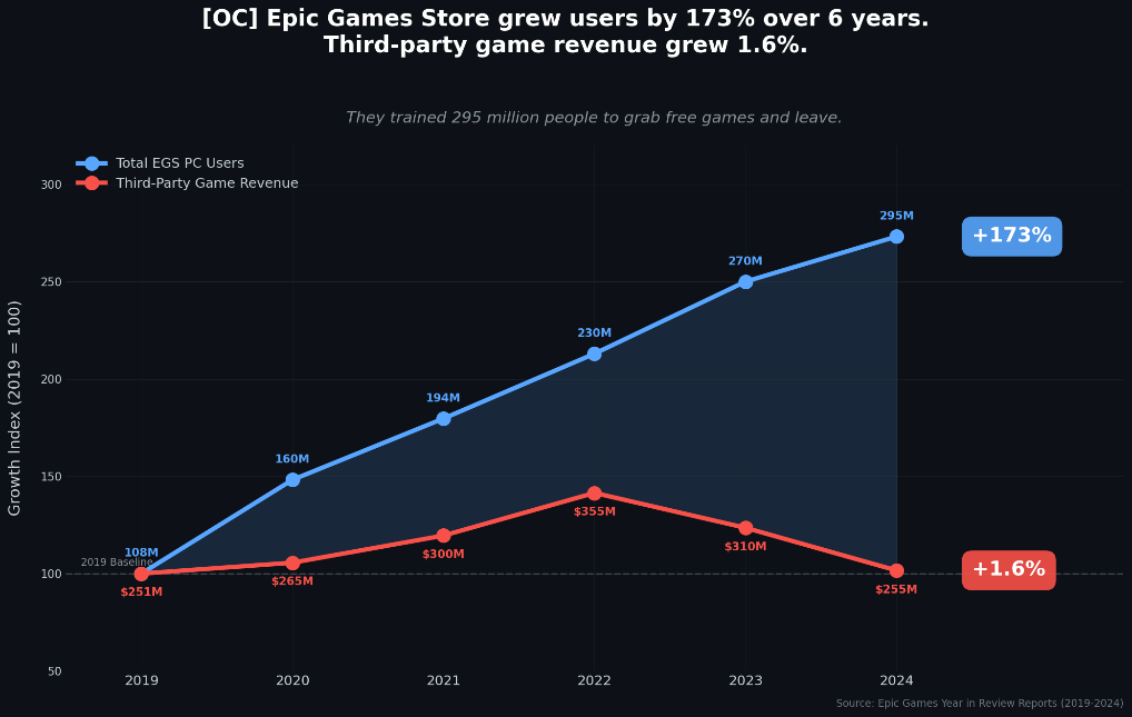 从2019年到2024年的六年时间里,Epic游戏商城的PC用户数从1.08亿增长到2.95亿,几乎翻了三倍,然而,其第三方游戏收入增速缓慢,甚至一度出现下跌趋势,以至于在2024年仅有2.55亿美元,几乎和2019年的2.51亿美元持平。