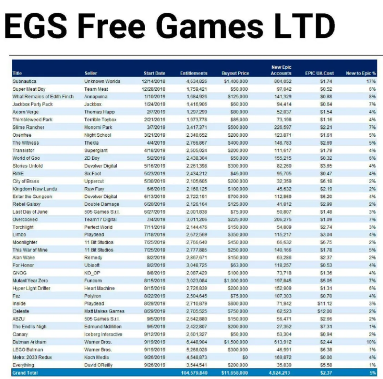 根据前些年Epic和苹果闹上法庭时流出的内部文件来看,Epic在2019年的9个月内送出38款游戏,耗费超过1160万美元。算上后续送出的《GTA5》《死亡搁浅》《霍格沃茨之遗》等大作,业界估计Epic在“免费游戏买断”上的累计支出已经在1.5亿至2亿美元之间。