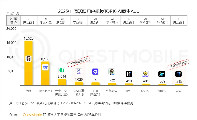 2025年底,有报道称豆包的DAU已突破1亿大关。根据QuestMobile最新发布的数据,豆包在2025年底的周活跃用户规模已突破1.5亿,大幅领先作为第二梯队的DeepSeek,和作为第三梯队的元宝、阿福、千问等。