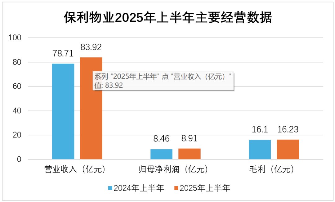 整体来看,上半年,保利物业实现营业收入83.92亿元,同比增长6.6%;归母净利润8.91亿元,同比增长5.3%;毛利维持住了正向增长,录得约16.23亿元,同比增加1%;期内溢利为9.04亿元,同比增加5.8%。