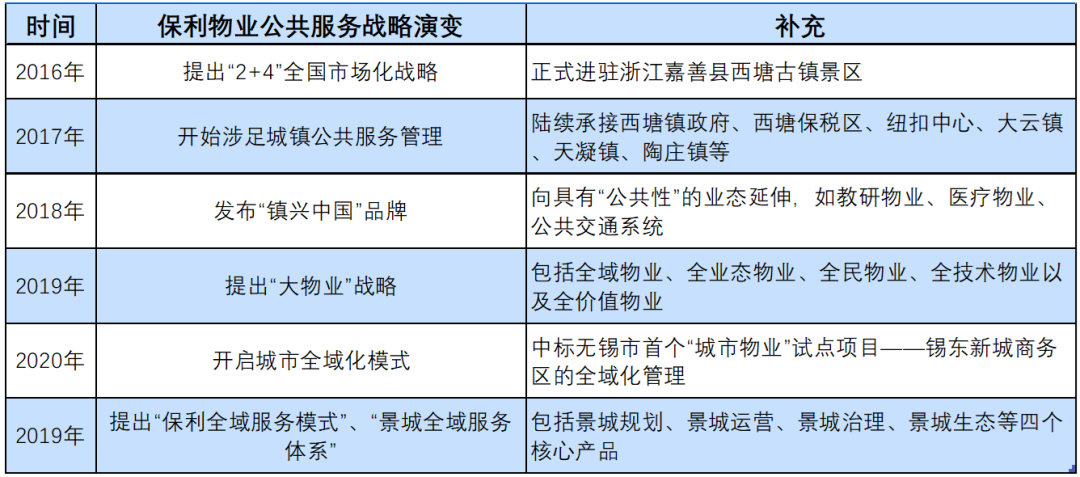 2018年,保利物业发布公共服务品牌“镇兴中国”,业态范围涵盖各种城镇、特色小镇、景区、产业园区等,并向具有“公共性”的业态延伸,如教研物业、医疗物业、公共交通系统等。