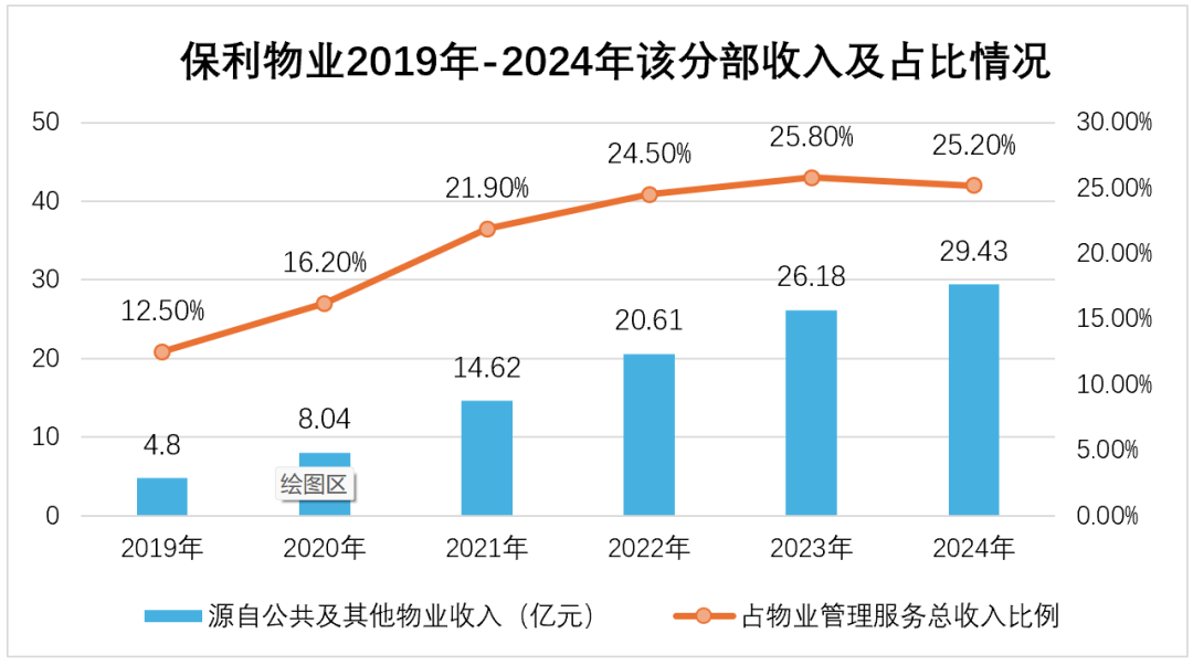 同样以上市后数据为例,2019年,保利物业源自公共及其他物业的收入约为4.81亿元,仅占物业管理服务总收入的约12.5%;到了2024年,该分部收入已达到29.43亿元,在物业管理服务总收入中的占比提升至25.2%。