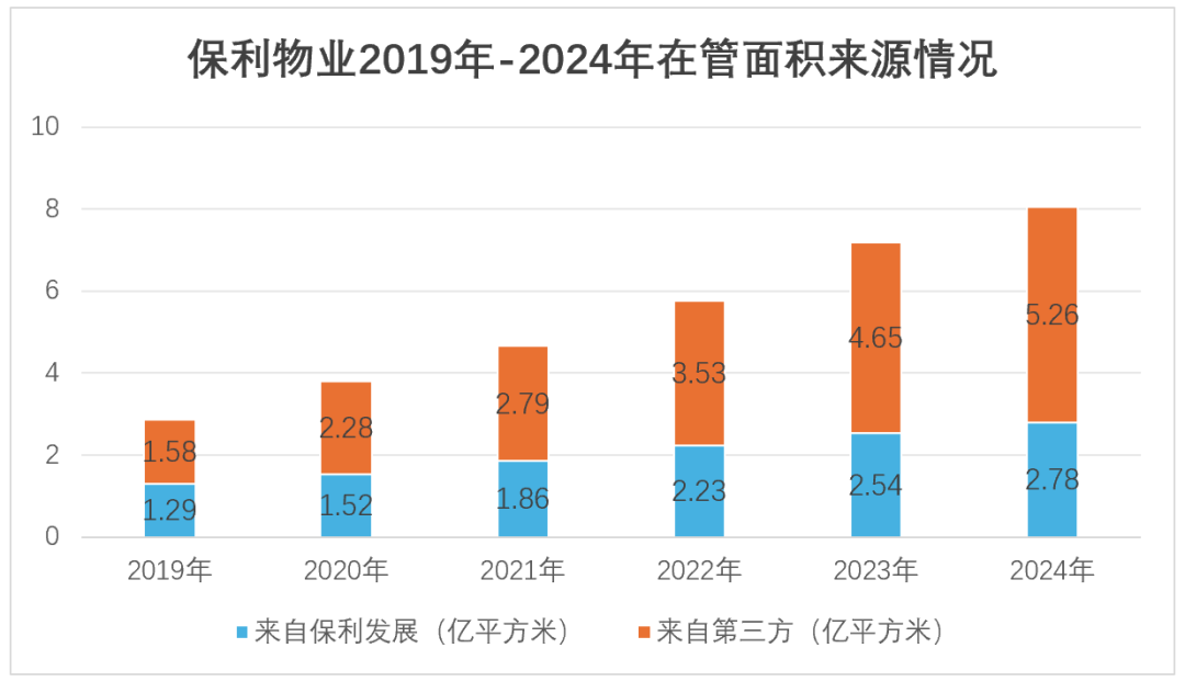 以2019年至2024年为例,保利物业在管面积由2.87亿平方米跃升至8.08亿平方米,其中来自保利发展的比例由44.9%减少至34.6%,来自第三方的比例则由55.1%提升至65.4%。
