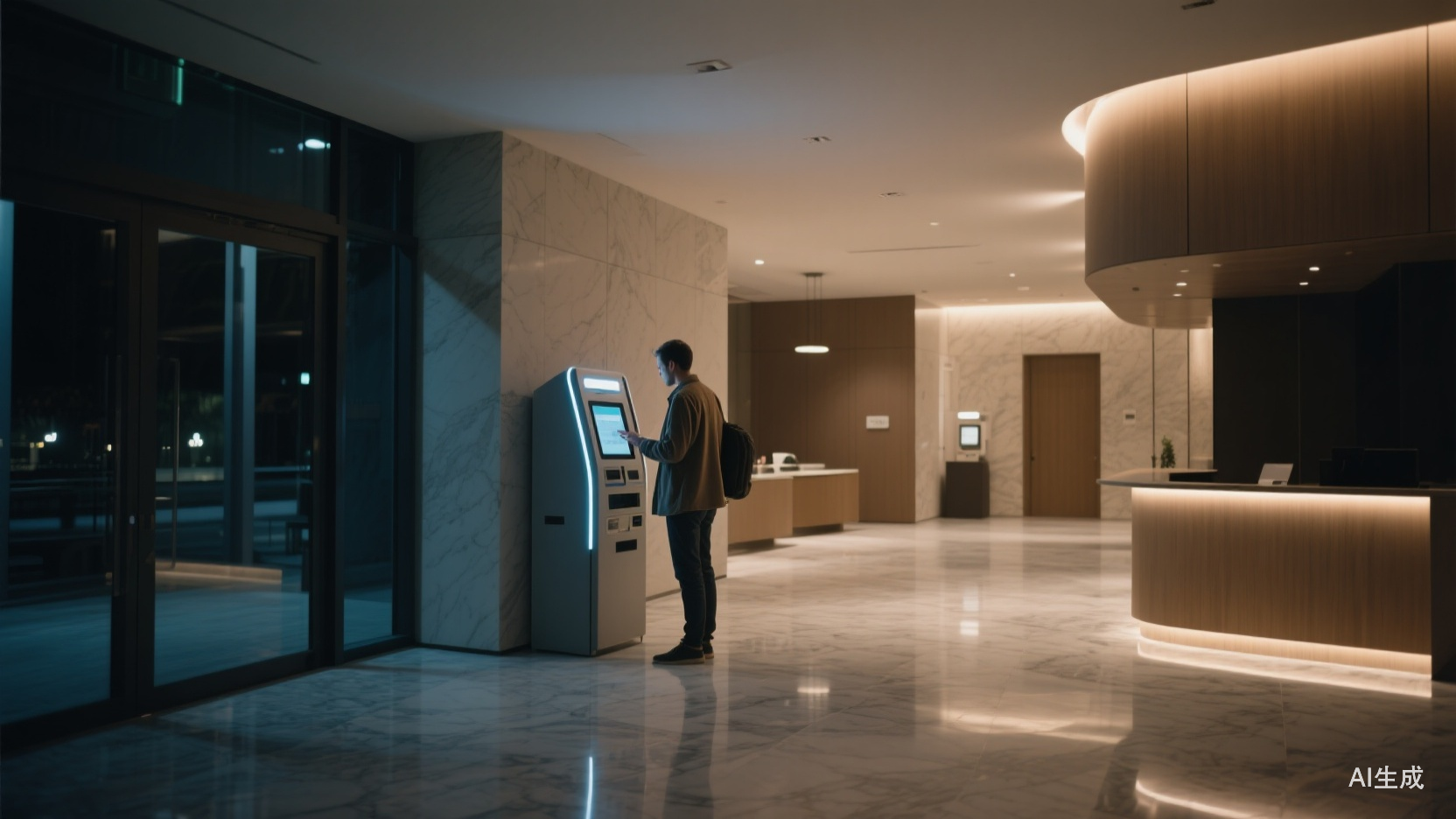 前台没有人,入口只立着一块竖屏,冷白色的光照亮整个空间。
