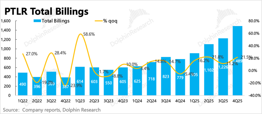 四季度财报体现的是一个新客增加、老客扩容的变现加速期的Palantir,无论是当期业绩还是公司指引、前瞻指标,基本都不错。