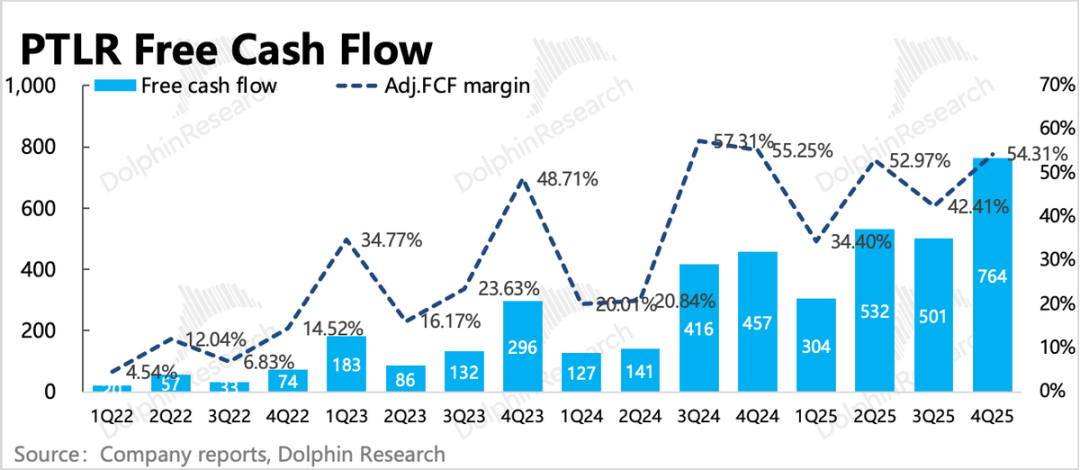 四季度Palantir实现GAAP下经营利润5.75亿,三项经营费用中本季度销售费用、管理费用的增长有明显下降。最终带来GAAP下经营利润环比提高了7个点,达到41%,加回折旧和SBC后的经调整经营利润达到57%。