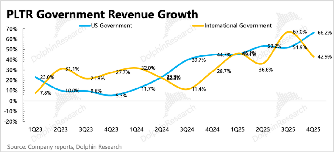 四季度国际收入主要依赖国际政府(如英国、阿联酋)的需求,但企业客户的需求低速稳定。我们之前说过,Palantir的本地保护主义、与美国国防部的深度捆绑,以及本身经营环境问题,从而影响了欧企客户的签单意愿。