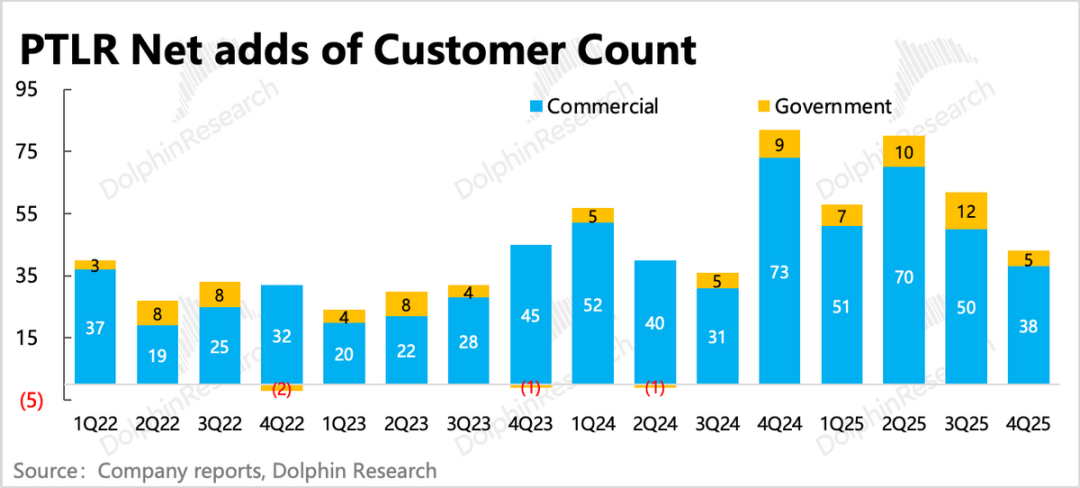 而从最直观的客户数,也偏中长期指标,四季度环比净增43家,其中38家来自于商业客户(基本是本地美企),5家来自政府。