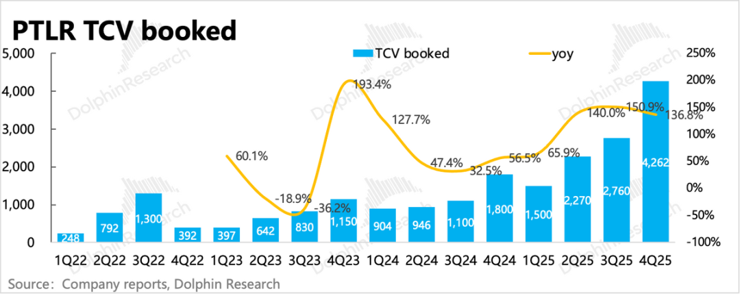 四季度记录的合同总价值为42.6亿,同比增长137%,环比增加15亿,和RPO基本同步。这也说明新增的合同基本都是锁定的需求,这似对Palantir的产品高度认可。