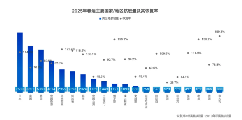 要知道,2025年春运期间,在中国出港境外的区域航班中,日本曾以绝对优势的航班量,遥遥甩开第二名,航班量还超过了2019年。