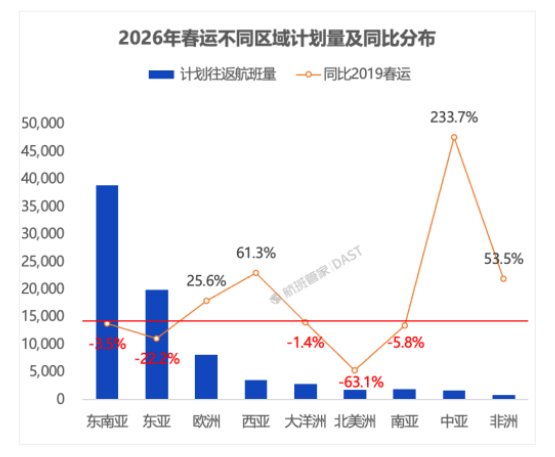 据航班管家预测,2026年春运民航国际市场,东南亚是最热门区域,航班量占国际总量的49%,预计恢复至2019年的96%。