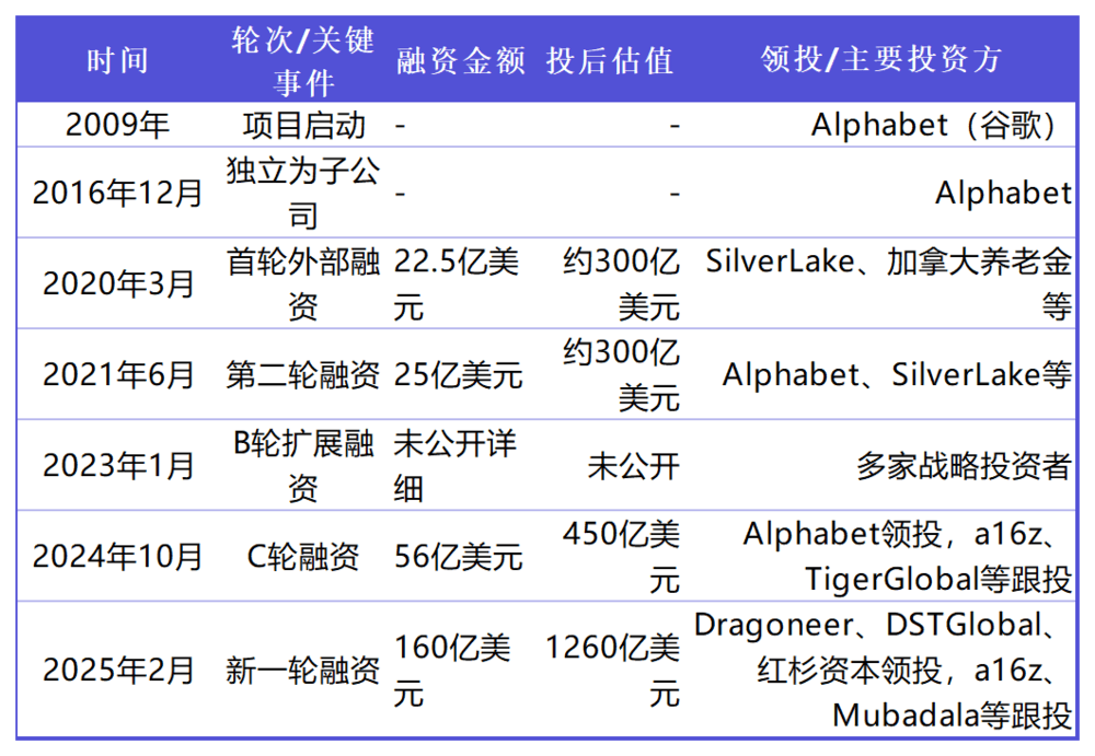 Waymo的融资历程清晰地勾勒出其从Alphabet内部孵化项目,成长为全球估值最高自动驾驶独角兽的路径。
