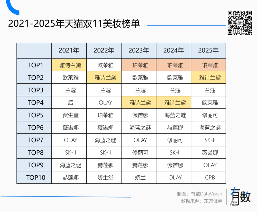 自2023年起,天猫双11美妆榜首连续3年是珀莱雅,抖音渠道则是珀莱雅和韩束轮流坐庄,国货战神的名头太响,以致无人在意珀莱雅的名字到底算不算抄袭。