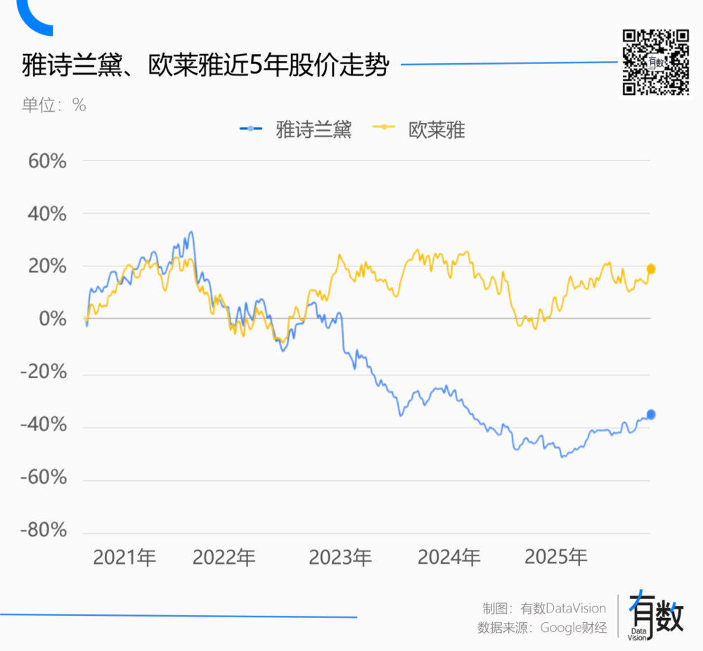 过去五年,雅诗兰黛的市值一度蒸发了1100亿,市值打了三折以后,又在去年成功挽回210亿美元。只是,眼见隔壁欧莱雅的股价走出截然不同的上扬曲线,沉默的巨头难免落寞。