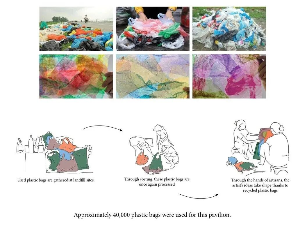 越南每年产生约2500万吨生活垃圾,从拥挤的城市街角到宁静的乡村田野,无处不在。垃圾不仅仅是日常生活的副产品,它反映了我们作为一个社会如何与环境互动。为了应对这一现实,T10A展馆主要由废弃塑料制成。超过四万个回收塑料袋被收集并改造用于建造这座展馆,这是一项社区驱动的行动,得益于众多志愿者的支持,他们帮助收集材料并直接参与了建造过程。