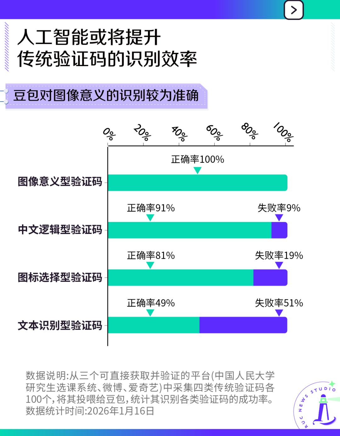 结果显示,除文本识别型验证码,其余三类验证码的正确率均在80%以上,豆包在图像意义的选择上甚至没有任何错误。而现有研究中,人类识别这几类验证码的正确率多在70%以上[6],豆包在图像认知上似乎已达到甚或超越人类平均水平。