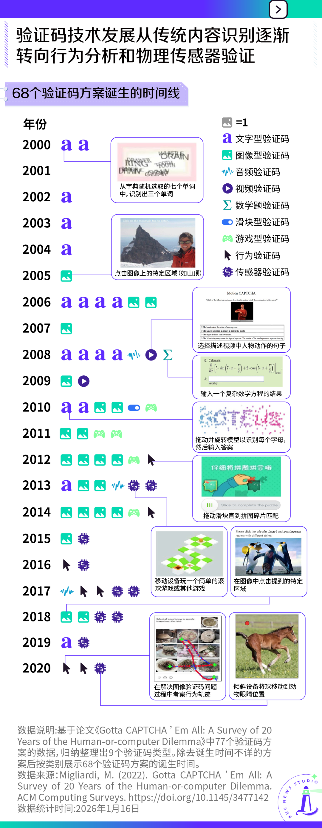 随后二十多年间,验证码技术不断创新,从文本到图像,从游戏到物理传感,形式日趋多样,考察难度与维度也与日俱增,不断在追问与反问的过程中找寻那些只有人能轻松解决的问题。