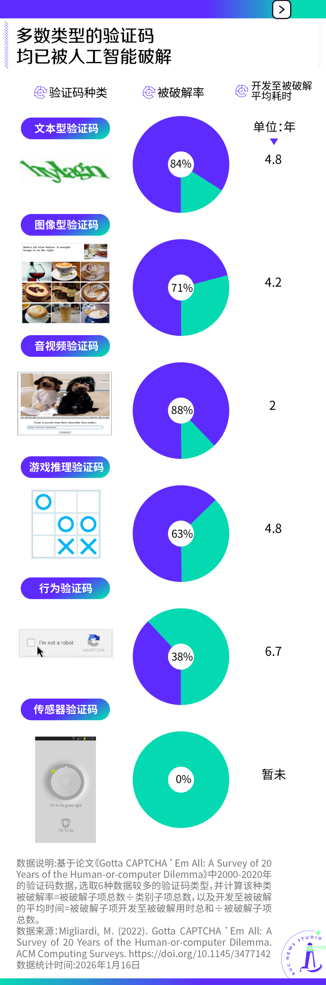数据可见,多数验证码都难逃被破解的命运。验证码的技术史,亦是一部破解技术的演化史。从破解的角度,攻击方证明相应问题并非人机之间的本质差异,倒逼防守方重新寻找答案;而AI的崛起,更像是这场持续的实验中一个最新引入的变量。