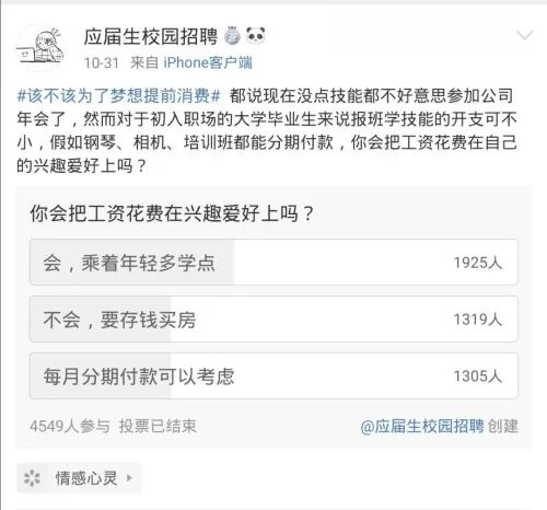 2019年10月31日,微博博主@应届生校园招聘发起了一则“该不该为了梦想提前消费”的话题讨论。在4549名参与者中,只有1319人明确表示了否定。