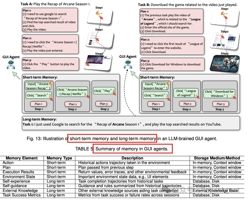 图注:一个由LLM驱动的GUl Agent短期任务与长期任务示意图。