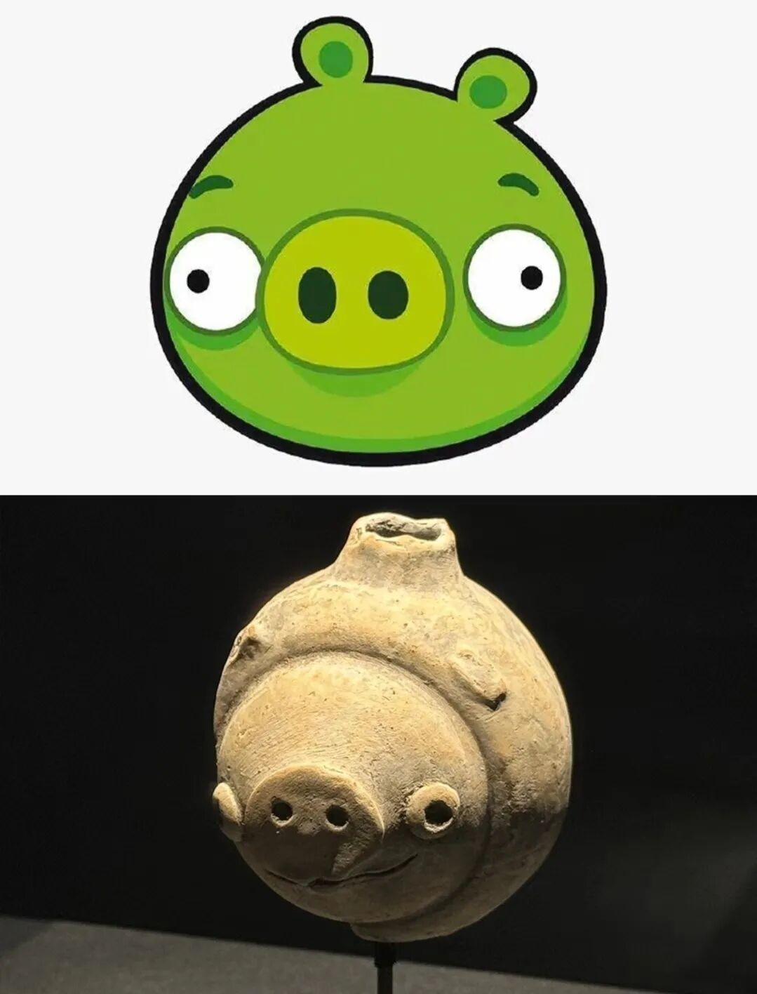 无独有偶,在四川广汉联合遗址出土的陶猪,酷似“愤怒的小鸟”里面的反派绿猪。