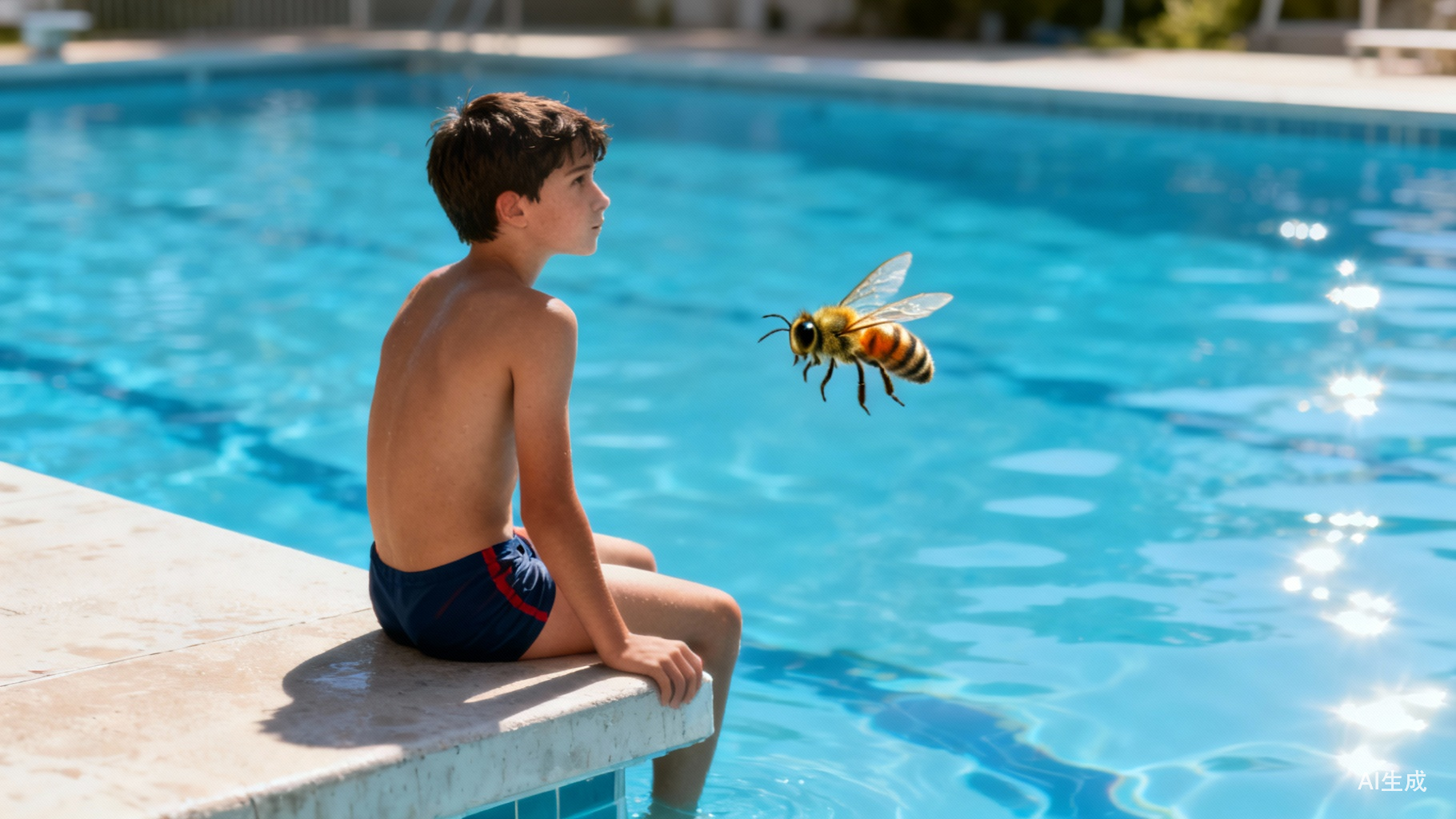 透过男孩的眼睛我们看到,他妹妹在浅水区跟同学玩游戏,爸妈躺在躺椅上晒太阳,妈妈喝的甜饮料上方还有一只几乎不动的蜜蜂。泳池另一头,是供高台跳水的白塔和一个深的方形跳水池;后面是快餐亭,头顶的金属喇叭放着单薄的流行歌。救生员晒得黝黑,一声吼就能定规矩。