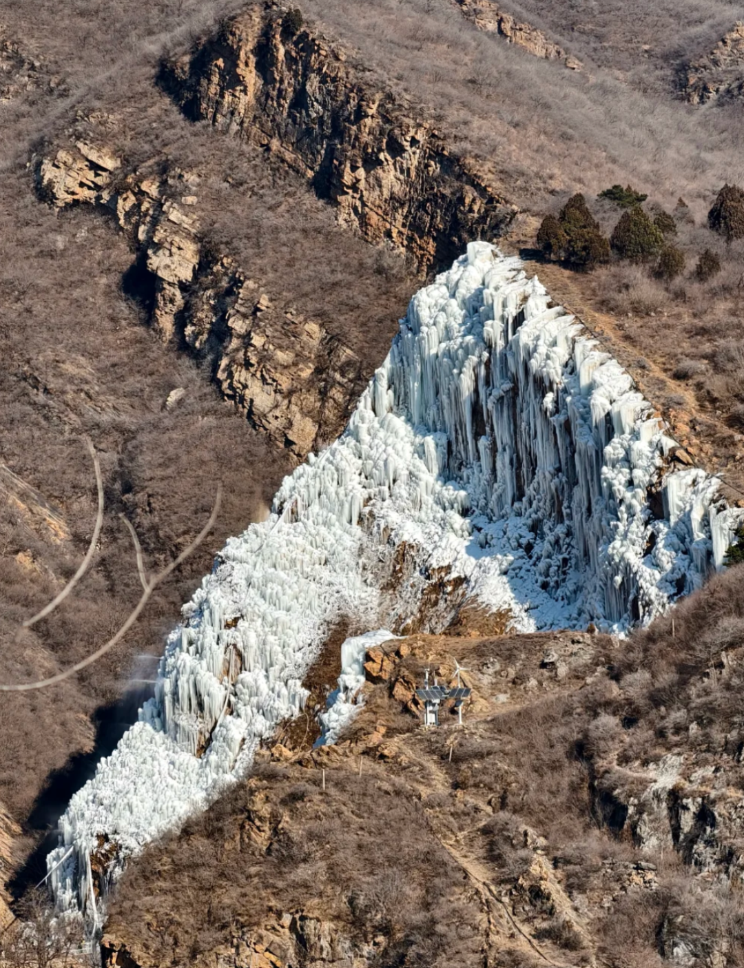 攀冰能够流行起来的前提之一是,攀冰场地逐渐从野生走向人造。北京周边分布着多处可供攀冰的大型人造冰瀑:神泉峡景区,虎峪自然风景区,桃源仙谷风景区,玉渡山景区,以及云蒙峡景区的人工冰瀑群。浇水形成的人造冰瀑镶嵌在土石堆里,远看相当突兀。