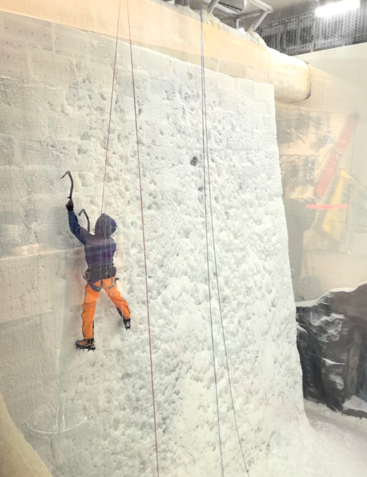 和滑雪一样,攀冰也逐渐从“大山里”走向了室内。成都、北京都在今年建起了室内攀冰场,这项运动的接近性又提高了,“终于可以边攀冰边吃外卖了”。