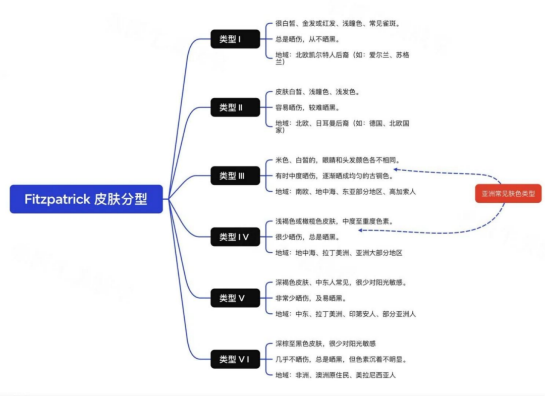 早在1975年,哈佛医学院皮肤科教授Thomas B.Fitzpatrick就提出著名的菲氏皮肤分型量表(Fitzpatrick Skin Type Scale),将人类皮肤分为六型,其中: