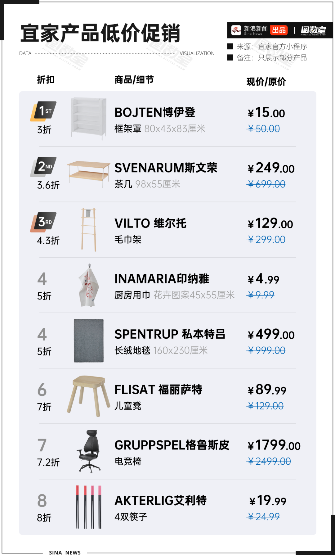 图数室整理了部分在售的折扣产品,发现其折扣力度从3折到8折不等,凸显宜家想用更低的价格,重新吸引顾客稳定市场的决心。