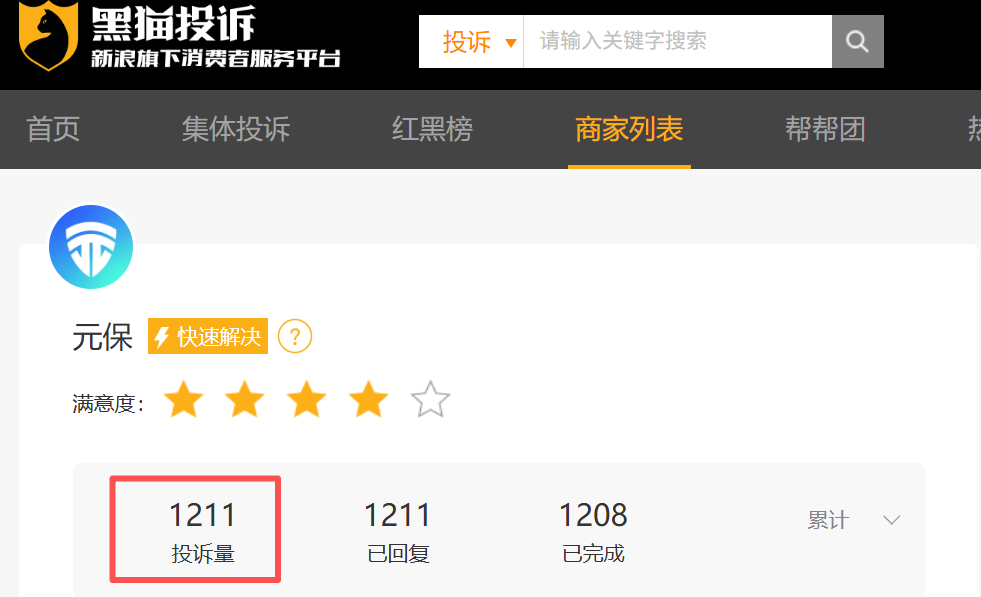 截至目前,在上述平台上针对元保的投诉量已升至1211起。
