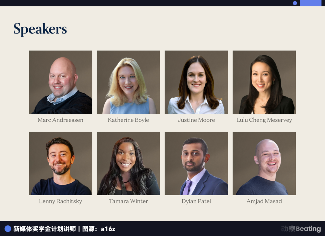 2025 年,a16z 推出的“新媒体奖学金”项目收到了超过 2000 份申请,最终只录取了 65 人。录取的学员背景五花八门,有来自 OpenAI、Google 的工程师,也有电影制片人。
