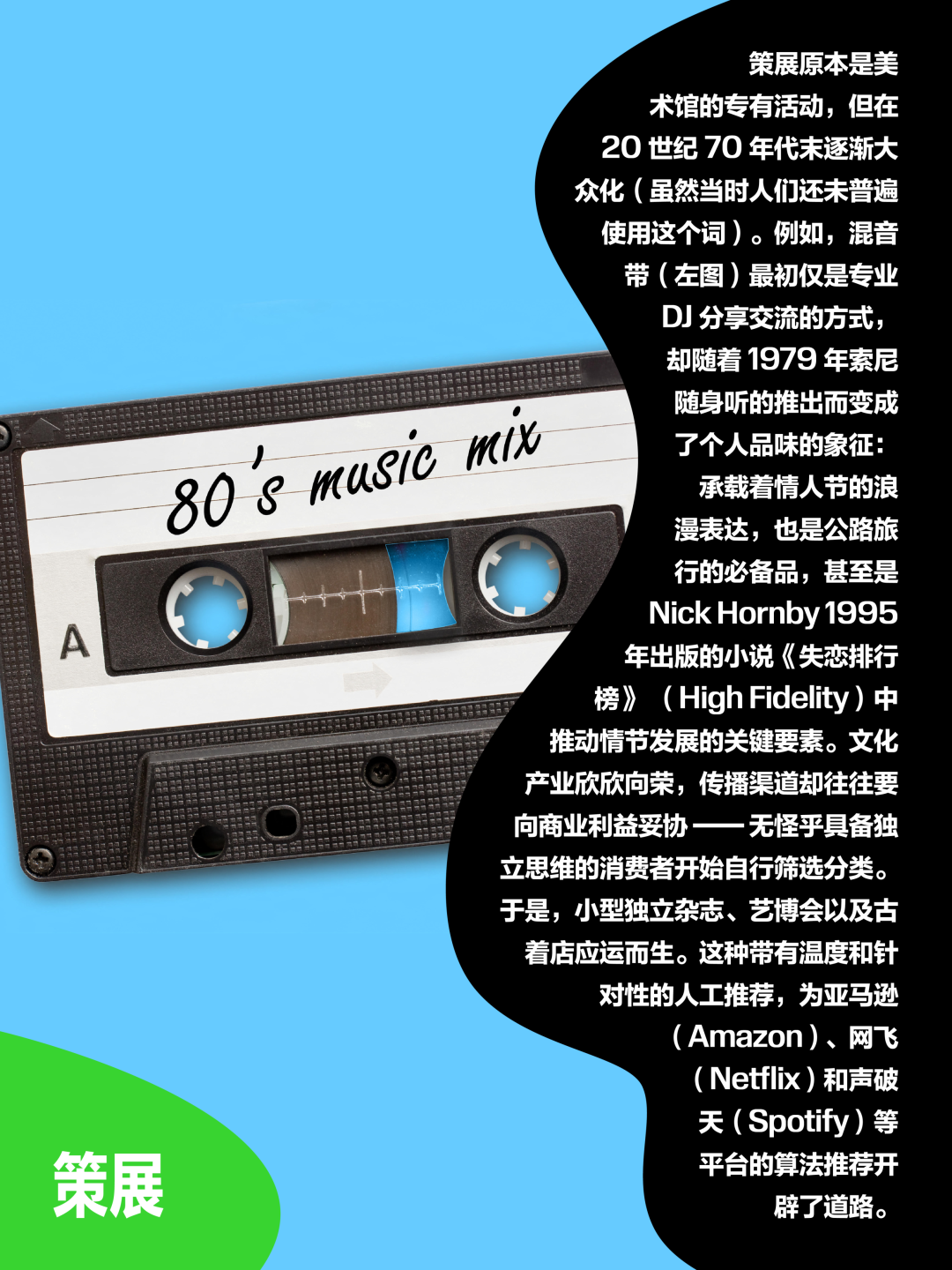 另类或小众意味着有眼光、有品味,而这在当时是一种身份认同:对年轻人而言,它的重要性丝毫不亚于今天的性别、种族和性取向等问题。(对许多人而言,这与身份认同意识的早期萌芽紧密相连。)四处搜寻一部冷门电影、去听朋友推荐的乐队、请二手书店的店员推荐一本小众杂志……这些如今运用算法就能实现的事情在过去需要有创造力和意志力才能完成。你会感觉可以像点菜一样随心所欲地选择自己的人生,按需选用,在过程中塑造自我。