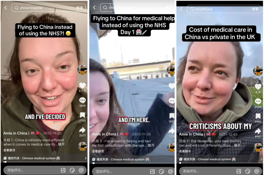 在TikTok上火了以后,有不少中国公司找到Amie,希望她能推广中国的医疗服务。尽管在中国看病费用更低,但Amie觉得,中国医疗对英国人的吸引力不在于便宜,而在于效率。