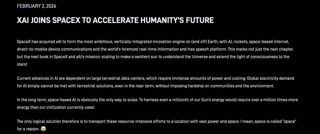 美国时间2月2日,马斯克旗下的人工智能公司xAI与商业航天公司SpaceX完成合并,从有消息传出到正式官宣仅经历3天。