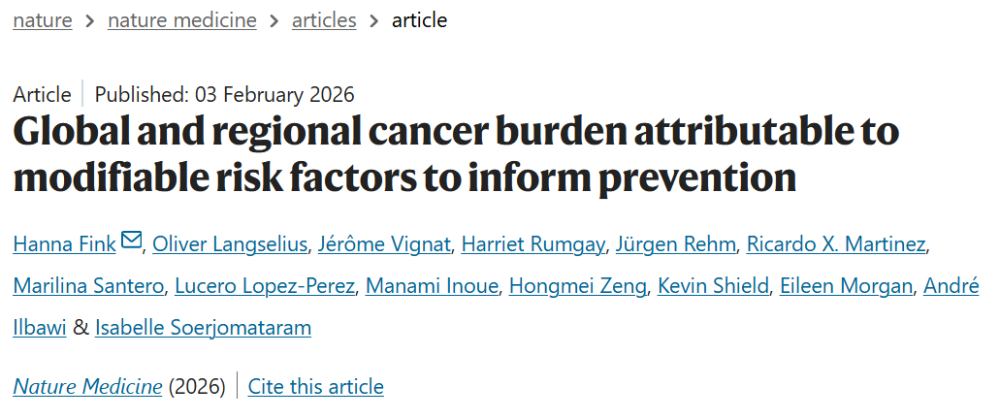 1.Fink,H.,et al.Global and regional cancer burden attributable to modifiable risk factors to inform prevention.Nat Med(2026).doi.org/10.1038/s41591-026-04219-7