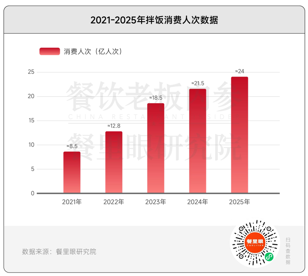 最近5年时间,拌饭品类消费人次从8.5亿跃升至24亿,近乎三倍的增长。曾经困于东北街巷、韩式料理店一隅的区域小吃,如今已成为米饭快餐赛道强劲的“增长极”。