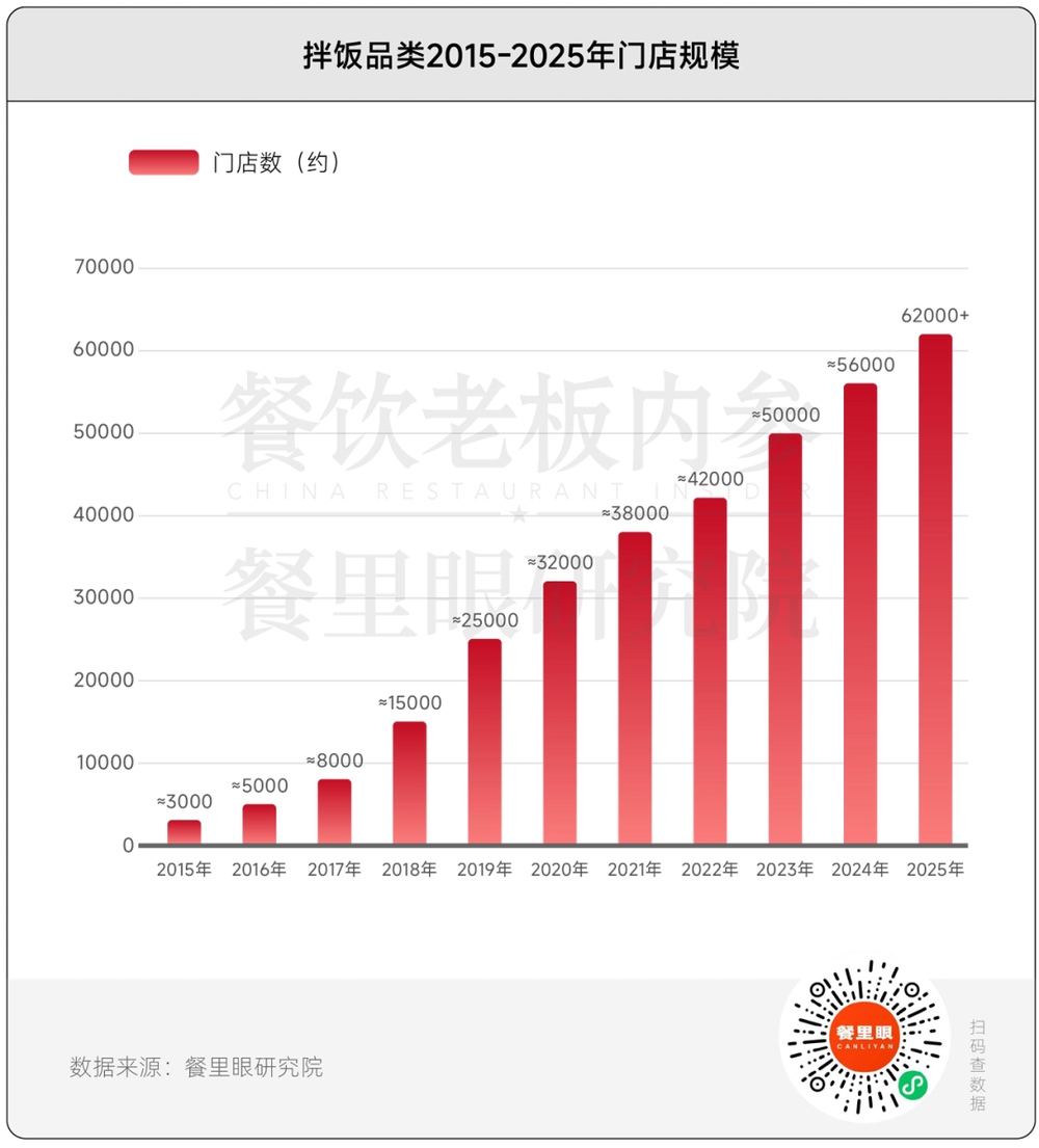 同步高速增长的,是拌饭的门店规模。餐里眼数据显示,2025年拌饭品类门店规模达到6.2万家。品类快速增长的背后,既依托于米饭饮食的国民刚需基础,也得益于堂食、外卖多渠道协同发力。同时,拌饭头部品牌的连锁化扩张与下沉市场的深度渗透,成为了重要增长引擎。
