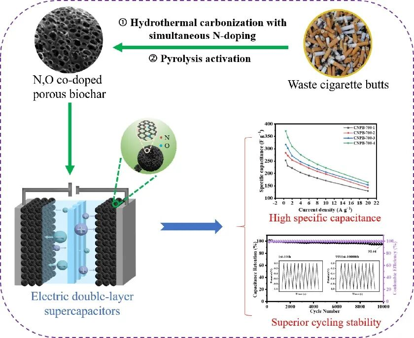 团队通过一种称为“水热碳化-热解活化”的工艺,将烟蒂这种有毒垃圾转化为氮氧共掺杂的多级纳米多孔生物炭(简称CNPB)。