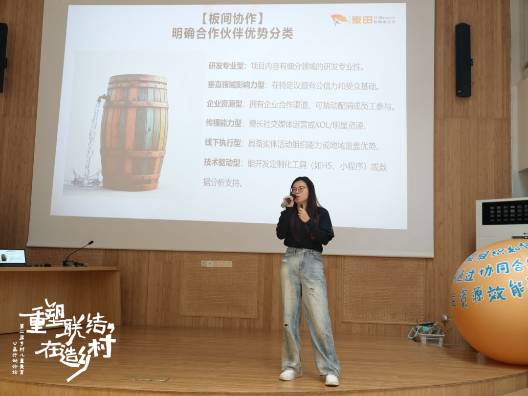 广东省麦田教育基金会副秘书长郑颖,以“新木桶理论”为核心,分享了麦田公益在资源整合与协同中的实践经验。图源:乡村儿童美育网络。