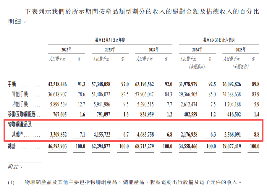 不过值得注意的是,出行业务和储能业务为传音带来的营收还十分有限。在港股招股书中,传音将物联网、储能、出行业务统一归类在物联网产品及其他收入中,2025年上半年,这部分业务收入仅为25.68亿元,在总营收中占比仅为8.8%。但物联网产品中还包含笔记本电脑、平板电脑、家用电器等产品,这意味着出行和储能业务带来的营收占比并不高。