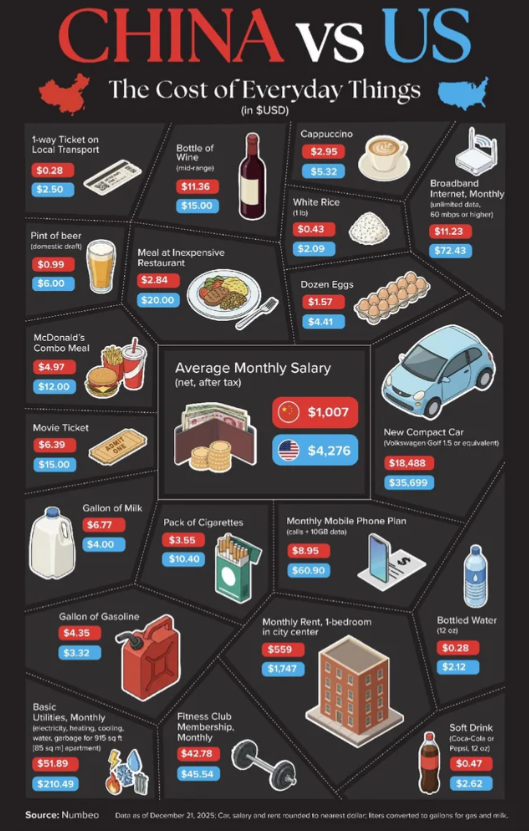 数据来源Numbeo是全球最大的生活成本资料库。图中对中国工资平均数的估计偏高,但美国工资数字没有扣医保和其他“非税损耗”,实际上基本公平