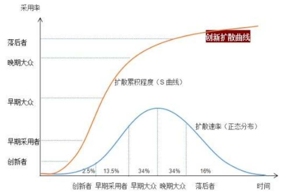 “晚期大众”:随大流主导的绝大多数社会成员,早期对理念冲击总是持怀疑和否定态度,直到“早期大众”大都转变后,因社会压力而转变。他们是社会的稳定力量。