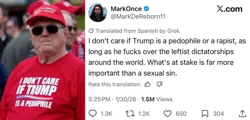 在这种“新观念/认知的社会推广中,无论如何都拒绝改变的“固化者”始终是存在的:无论是爱泼斯坦文件对于一些美国人(如图),还是“斩杀线”对于一些死硬中国公知——左侧系美国人用AI生成的梗图,但其言论(右图)和给他点赞的650个人却是真实存在的