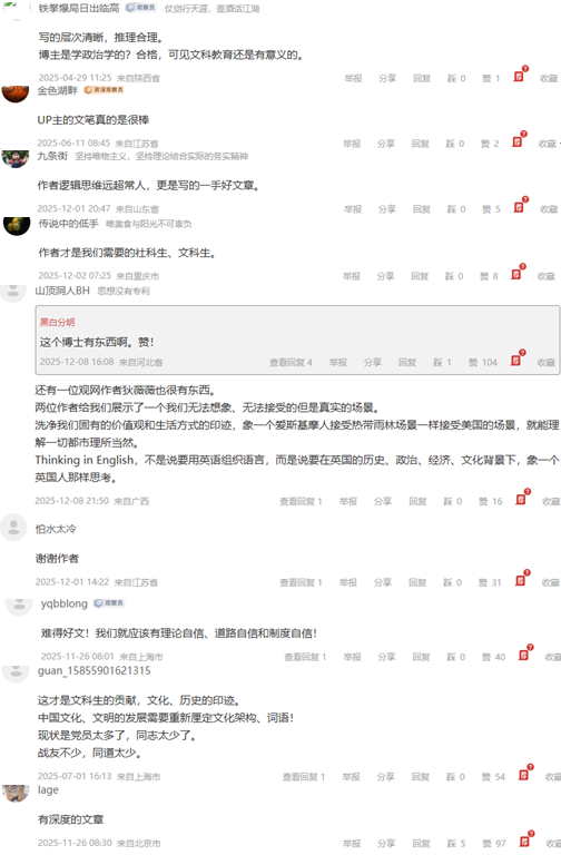 类似地,“小红书难民潮”事件和“斩杀线”事件都证明,圈地自萌、对外封锁、讨论向内,无助于打开“解决被骂问题”的局面;许多人理想中仅限于“公派化、精英名校化、STEM化的‘受尊敬’留学生”群体,无助于打开“取得观察对方最底层窗口”的局面。小红书自身对外界的开放性(我国大多数社交平台外国人无法在境外注册)、政策和社会整体环境对小红书本身生态的包容、一个大规模低水平留学生土壤的客观存在(必须要低到一个相当的程度,才能产生牢A与他的工作环境接触的机会),反而成就了2025年中国对外舆论认知“两次大战”的成功。