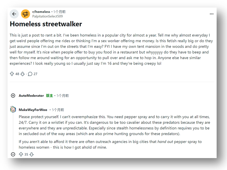 更不要说看到这类帖子(就不翻译了),有稳定开销的笔者甚至无法判断,一个美国女大学生万一断供时,“清清白白乞讨”究竟是不是一种比“靠糖爹租个屋檐”更合理的选择
