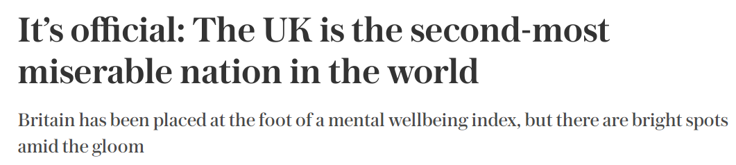 早在2023年,在一项心理健康调查中显示,英国是位列「全球第二miserable的国家」。