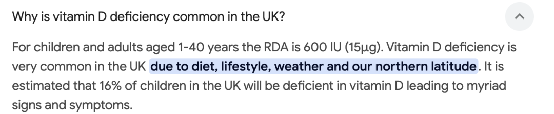 NHS每年也会不遗余力在宣传冬季补充维D的必要,英国国家饮食与营养调查数据库(NDNS)曾出示官方调查数据,显示英国五分之一的成年人缺乏维D。
