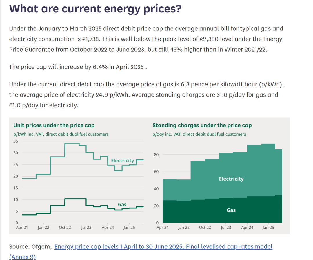 ■根据英国议会官方数据表明,2025年天然气和电力消费的平均年账单为1738英镑。2022年10月-2023年6月的能源价格最高,为2380英镑。但到2025年4月,价格上限将提高6.4%。